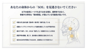 メリット: 「歯を治したら体調が良くなった」という状態を科学的な根拠に基づいて目指します。